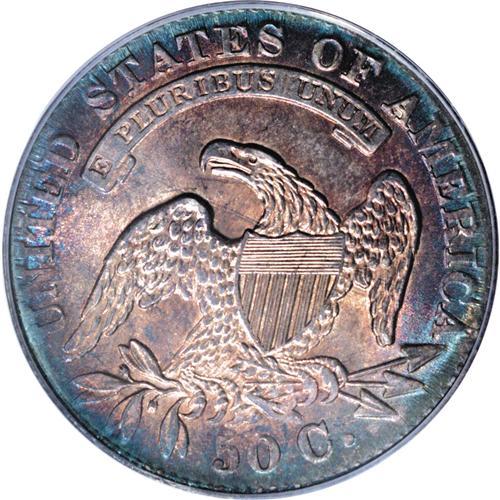 <B>1833 50C MS63 PCGS.</B></I> O-112, R.2. Most easily attributed by wide recutting on star 10, and the A in STATES positioned sharply higher than the second T. The mint luster enhances the attractive toning on this original half dollar. The centers are deep gray-rose and are surrounded by cobalt-blue at the margins. Sharply struck throughout.<BR><BR><b>Shipping:</b> Coins & Currency (<a target="_blank" href="http://www.heritageauctions.com/common/shipping.php">view shipping information</a>)