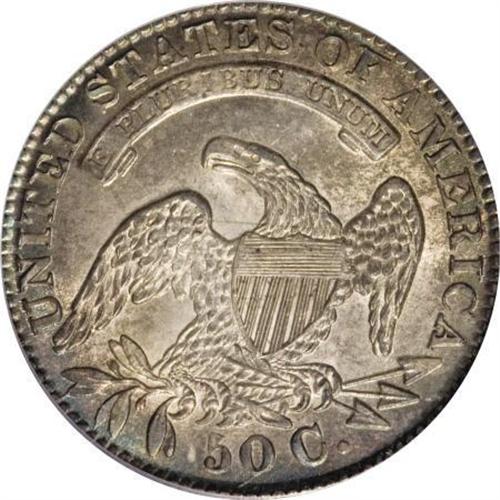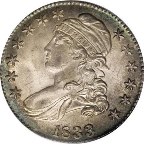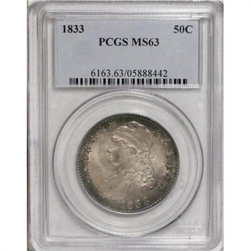 <B>1833 50C MS63 PCGS.</B></I> O-102, R.1. A gorgeously unabraded Select Capped Bust half that boasts a crisp, even strike. Satin luster shimmers across the cream-gray fields and devices. The borders offer sea-green and autumn-brown toning. Overton-102 is identified by its recut star 1 and a curved die line on the reverse at 6 o'clock.<BR><BR><B>Coin Engraver:</B> John Reich<BR><BR><b>Shipping:</b> Coins & Currency (<a target="_blank" href="http://www.heritageauctions.com/common/shipping.php">view shipping information</a>)