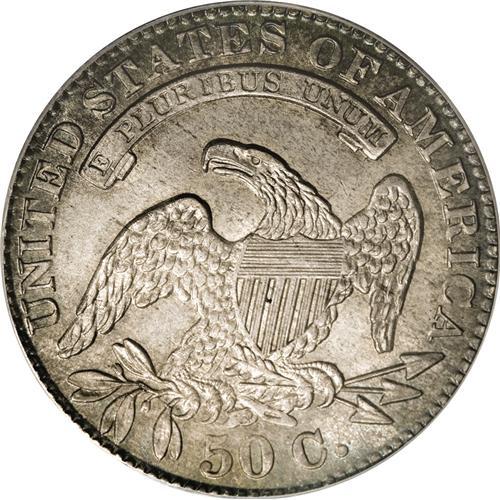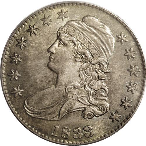 <B>1833<50C> MS64 PCGS.</B></I> O-114, R.2. A pleasing blend of sea-green, cobalt-blue, and coral-gray toning adorns the well preserved surfaces of this attractive near-Gem. Surface preservation is outstanding and the only abrasions are small, few, and far between.
