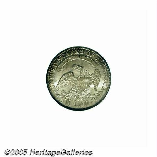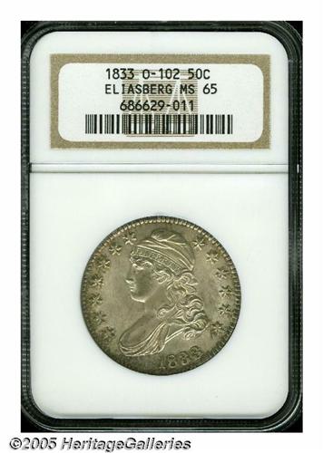 <B>1833<50C> MS65 NGC.</B></I> O-102, R.1. Freckles of golden-brown toning adorn the margins, while battleship-gray color graces the remainder of this lustrous and sharply struck Gem. Refreshingly unperturbed by contact, the portrait is particularly unabraded. Liberty's profile is strike doubled. NGC O-102 population: 1 in 65, none finer (6/05).<BR><I>Ex: Louis E. Eliasberg, Sr. Collection (Bowers and Merena, 4/97), lot 1882, which realized $4,180.</B></I>