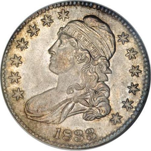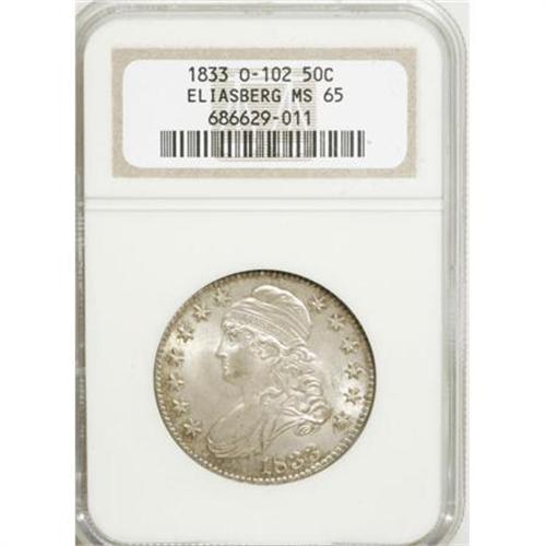 <B>1833 50C MS65 NGC.</B></I> Ex: Eliasberg. O-102, R.1. Freckles of golden-brown toning adorn the margins, while pearl-gray color graces the remainder of this lustrous and sharply struck Gem. Refreshingly unperturbed by contact, the portrait is particularly unabraded. Liberty's profile is strike doubled. NGC O-102 population: 1 in 65, none finer (10/07).<BR><I>Ex: Louis E. Eliasberg, Sr. Collection (Bowers and Merena, 4/97), lot 1882, which realized $4,180.</B></I><BR><BR><B>Coin Engraver:</B> John Reich<BR><BR><b>Shipping:</b> Coins & Currency (<a target="_blank" href="http://www.heritageauctions.com/common/shipping.php">view shipping information</a>)