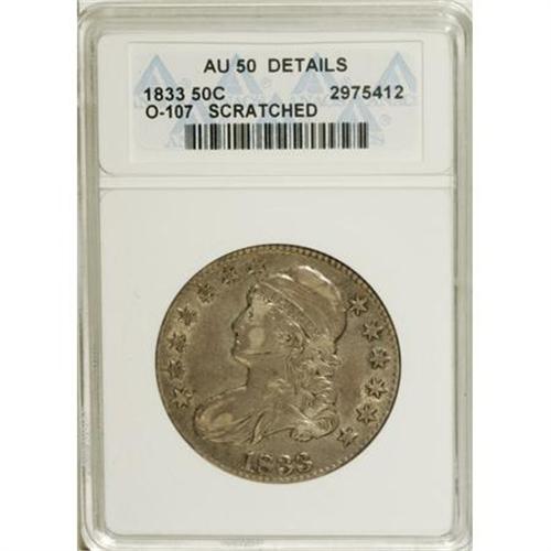 <B>1833 50C --Scratched--ANACS. AU50 Details.</B></I> O-107. NGC Census: (43/719). PCGS Population (84/559). Mintage: 5,206,000. Numismedia Wsl. Price for NGC/PCGS coin in AU50: $221. (#6163)<BR><BR><b>Shipping:</b> Coins & Currency (<a target="_blank" href="http://www.heritageauctions.com/common/shipping.php">view shipping information</a>)