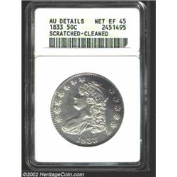 1833 50C--Scratched, Cleaned--ANACS. AU Details, Net XF45. O-113, R.2. Bright from cleaning with a swath of purplish toning between 12 and 3 o'clock on the obverse rim. Important notice: We expect to be auctioning lots at the rate of 200-250 per hour. Sometimes eBay Premier live bid software cannot keep up with that pace, so we strongly recommend that you place a realistic proxy bid now as insurance to avoid disappointment. Also please note that all Heritage/CAA lots purchased through eBay Premier carry a 20% Buyer's Premium. Please make sure you read the Terms and Conditions.