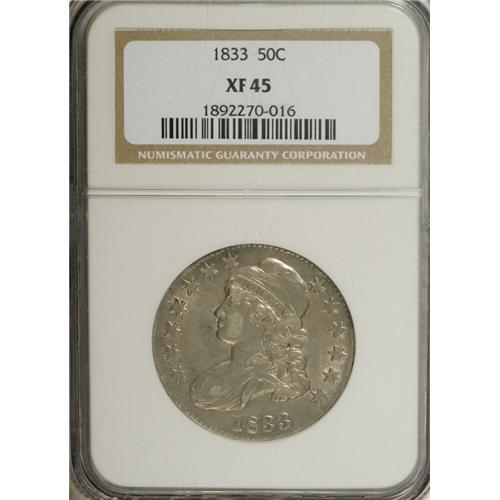 <B>1833 50C XF45 NGC.</B></I> O-106, R.2. This tan-gray Bust half is smooth aside from a few unimportant edge marks. The major devices are attractively defined, although the stars are generally soft.<BR><BR><b>Shipping:</b> Coins & Currency (<a target="_blank" href="http://www.heritageauctions.com/common/shipping.php">view shipping information</a>)