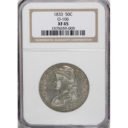 <B>1833 50C XF45 NGC.</B></I> O-106. NGC Census: (67/782). PCGS Population (77/663). Mintage: 5,206,000. Numismedia Wsl. Price for NGC/PCGS coin in XF45: $124. (#6163)<BR><BR><B>Coin Engraver:</B> John Reich<BR><BR><b>Shipping:</b> Coins & Currency (<a target="_blank" href="http://www.heritageauctions.com/common/shipping.php">view shipping information</a>)