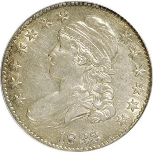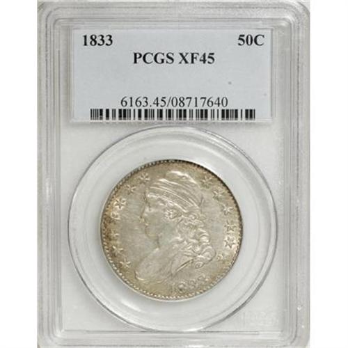 <B>1833 50C XF45 PCGS.</B></I> . PCGS Population (81/701). NGC Census: (73/801). Mintage: 5,206,000. Numismedia Wsl. Price for NGC/PCGS coin in XF45: $198. (#6163)<BR><BR><B>Coin Engraver:</B> John Reich<BR><BR><b>Shipping:</b> Coins & Currency (<a target="_blank" href="http://www.heritageauctions.com/common/shipping.php">view shipping information</a>)