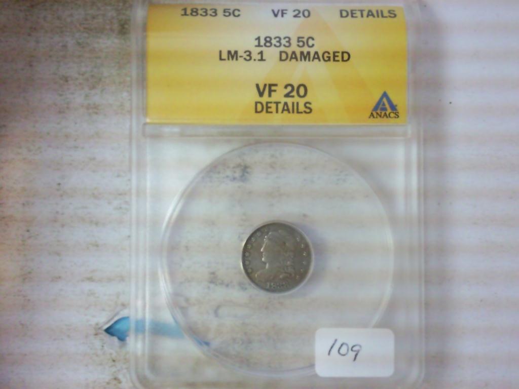 1833 BUST HALF DIME ANACS (VF 20 DETAILS) DAMAGED