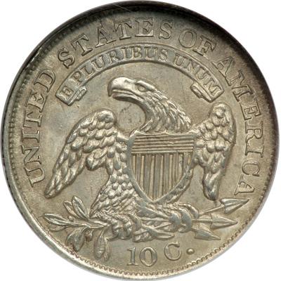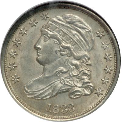 1833 Capped Bust Dime. NGC graded MS-64. Light even gray toning. Well struck. Muted old-silver luster graces satiny and original (uncleaned) surfaces. Varying hues of gray mingle with faint gold iridescence. An attractive MS64 that wears its sharp strike proudly. Pop 49; 27 finer.