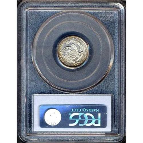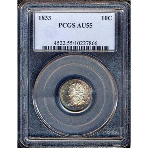 <b>1833 Capped Bust Dime. PCGS graded AU55.</b> Nice and frosty with sharp centers, the usual "spotlight" effect from this consignor's collection, and beautiful toning at the rims. All things come together into a harmonious whole <b>(PCGS # 4522)</b> <i>