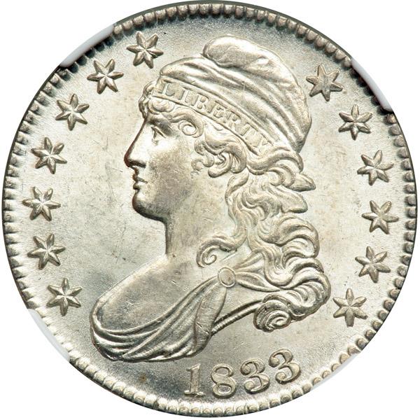 1833 Capped Bust Half Dollar. NGC graded MS-65. A frosty white coin. The surfaces are bright with moon-glow freshness and show none of the muting often affecting on dates in the 1830s. We could spend hours describing the luster. However, the grade says a lot about its freshness, its originality. Such, then, for luster. Turning to the other key indicator, a coin that is desirable with this meticulous strike on the hair curls and cap, Liberty's drapery as well. The eagle shows abundant detail in its plumage. If any weakness is to be found, it runs down the right-hand side of the shield and impacts (slightly) the claws on that side. Spot-free; gleaming, and a solid Gem MS65. Pop 21; 5 finer, 2 in 66, 2 in 67, 1 in 68.