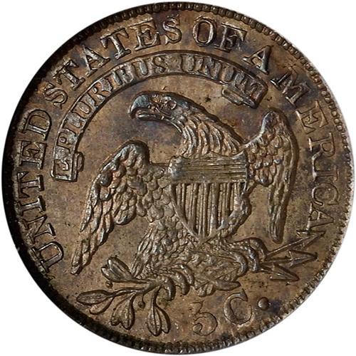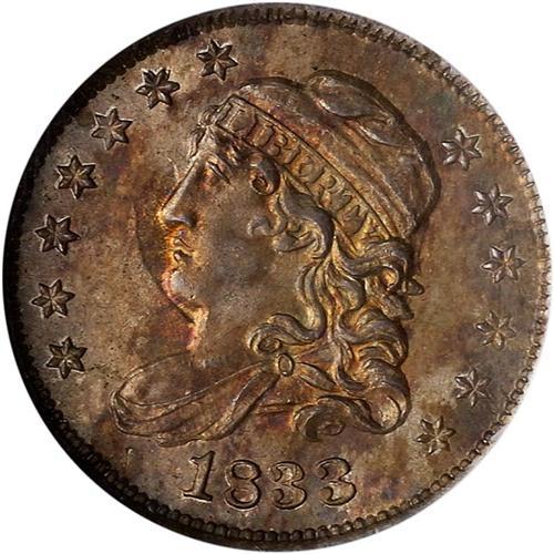 Scarce, the variety of the Wide Even Date with the O in OF repunched over a much larger O. Toned steel-grey, gold and blue. Fully struck. The line on the obverse may appear to the eye as a scratch but thankfully it is only a break in the luster when examined under a twenty-eight power loop. There is however, a small hit at the eagles beak that keeps this little beauty out of the next grade. Only twenty-two coins certified finer by either service. Bids $3500 and trends $4000.