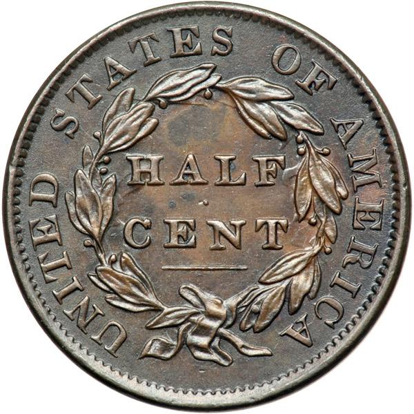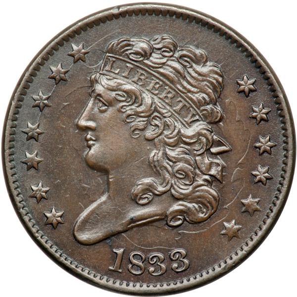 1833 C-1 R1 AU50. Choice glossy chocolate and steel brown. A tiny rim nick at K-11 on the obverse is the only mark on otherwise flawless surfaces. LDS, Manley state 3.0, with sharp die clashmarks on both sides. A very attractive half cent, and the extensive die clashmarks add to the eye appeal. Davy #33.1.13.