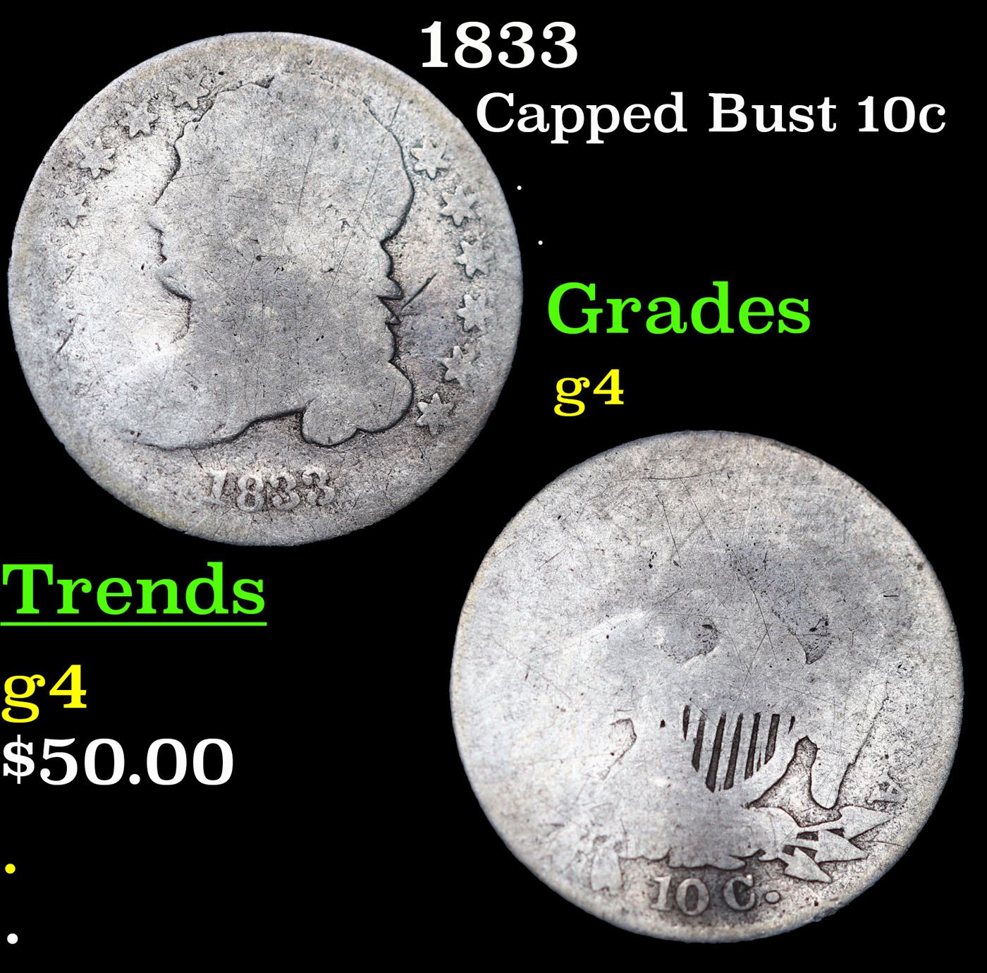 1833 Capped Bust Dime 10c Grades g, good.