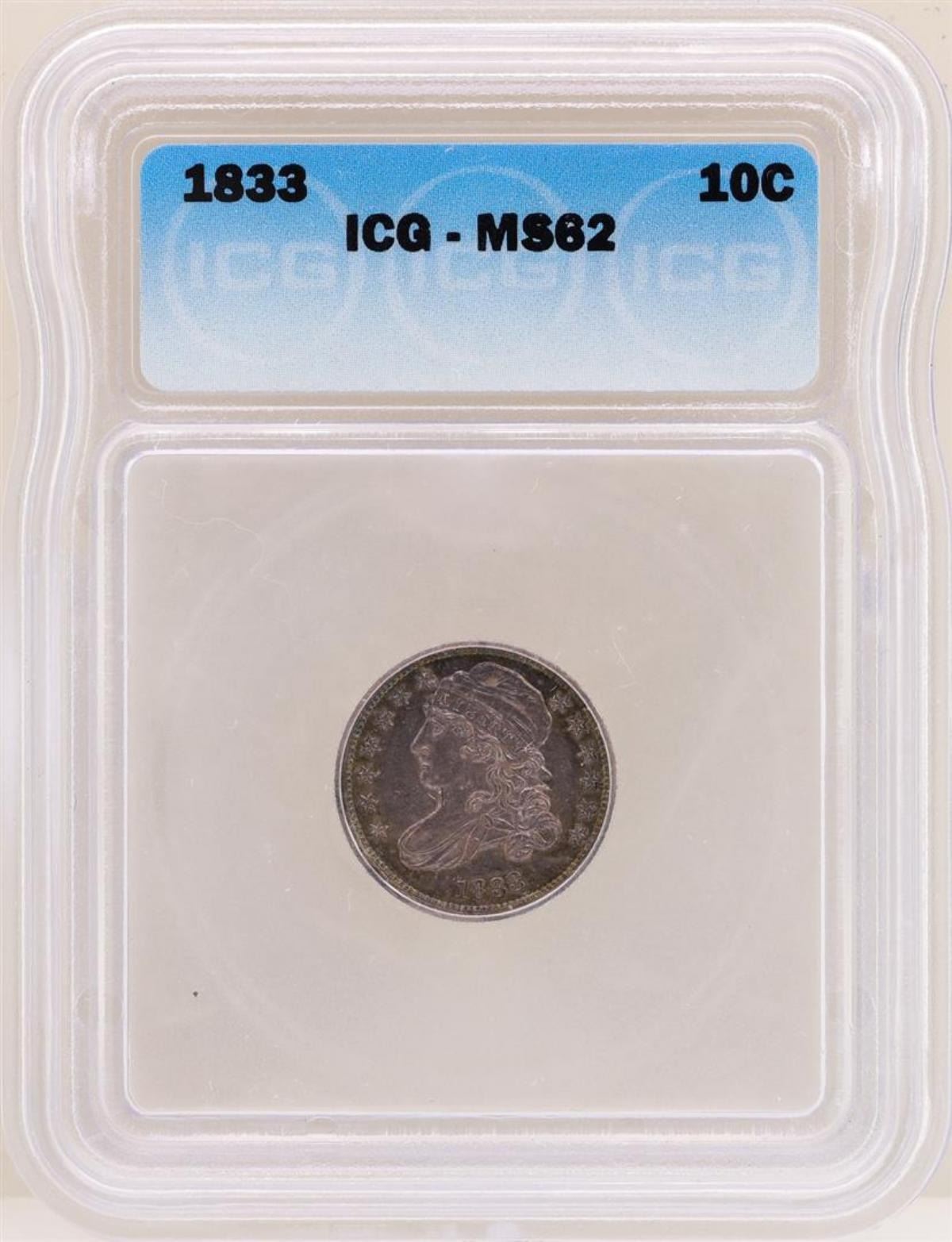 One 1833 Capped Bust Dime Coin ICG MS62. ICG Appraised.