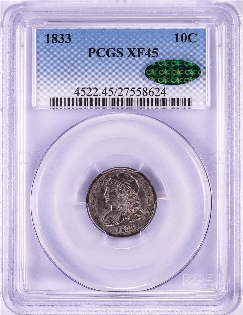One 1833 Capped Bust Dime Coin PCGS XF45 CAC. PCGS Graded.