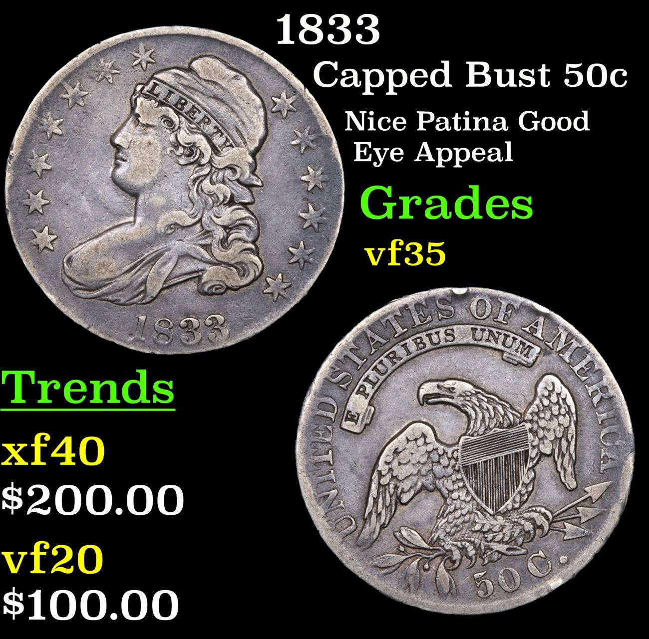 1833 Nice Patina Good Eye Appeal . Capped Bust Half Dollar 50c Grades vf++.