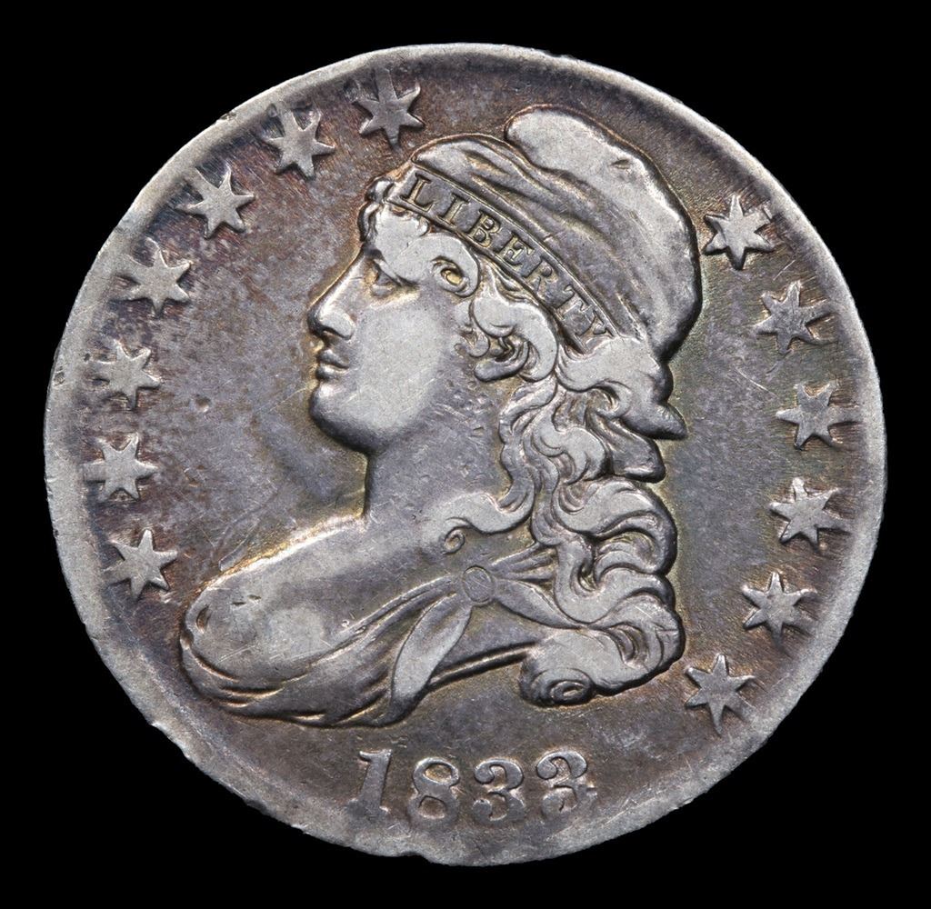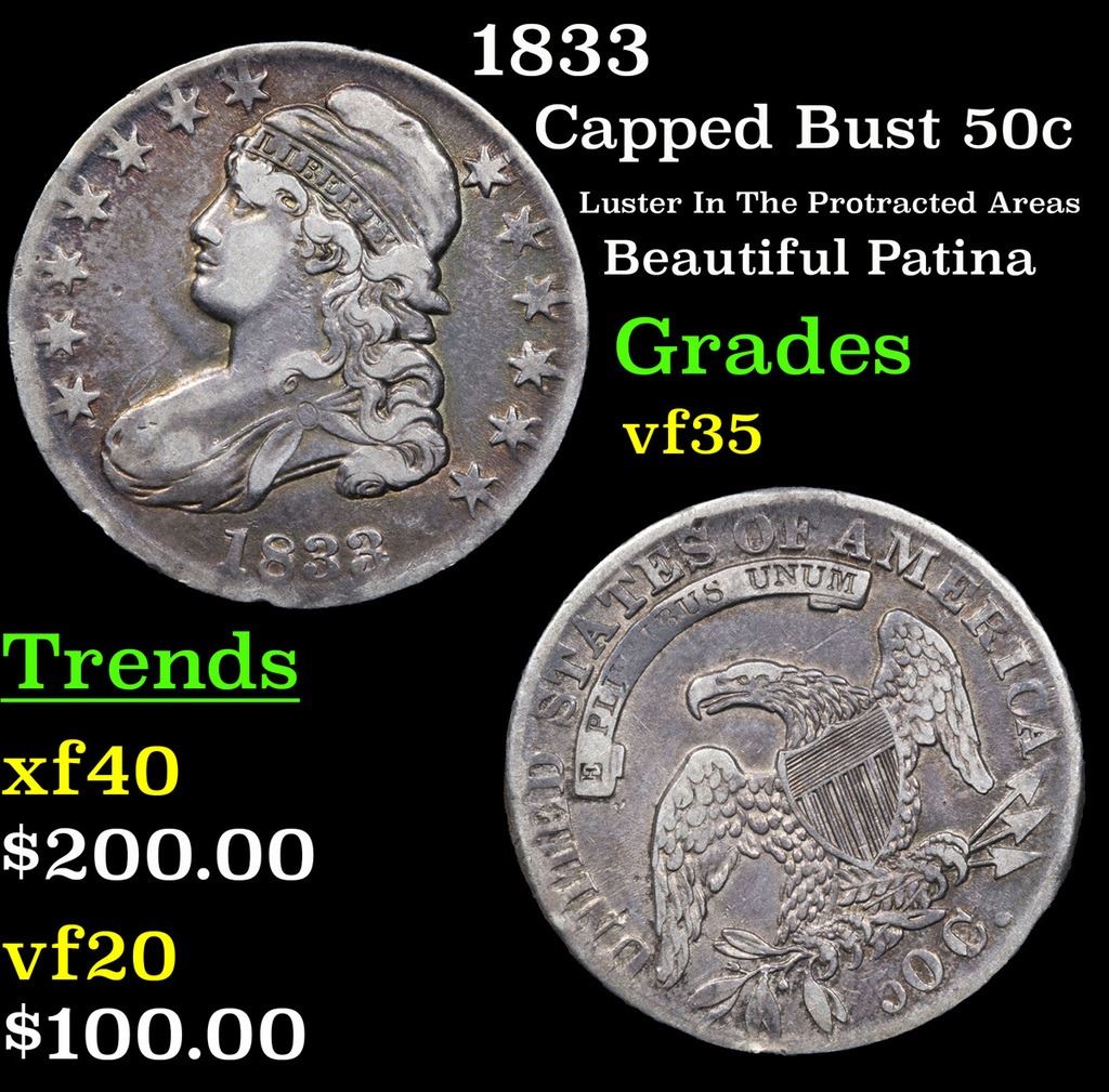 1833 Luster In The Protracted Areas Beautiful Patina Capped Bust Half Dollar 50c Grades vf++.