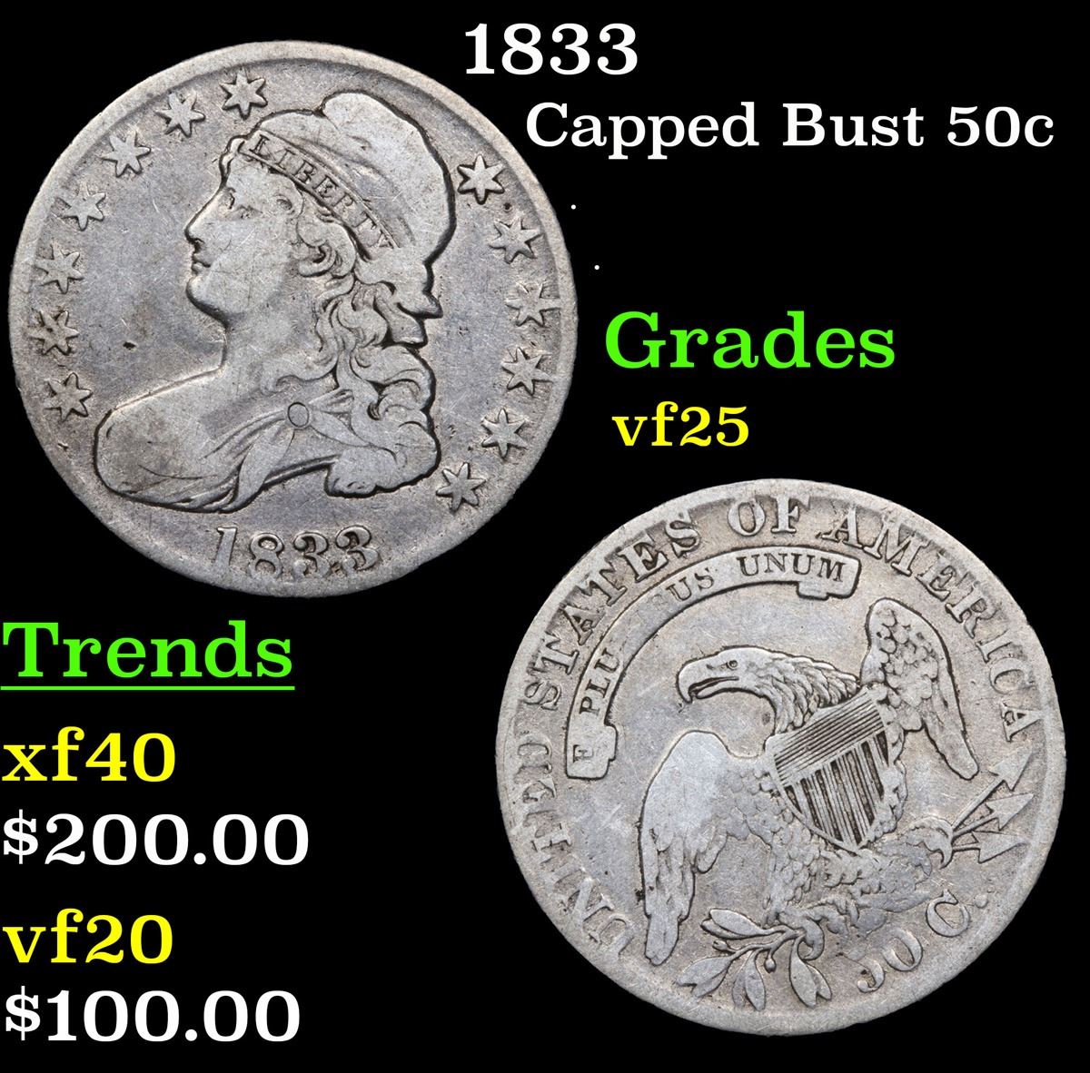 1833 Capped Bust Half Dollar 50c Grades vf+.