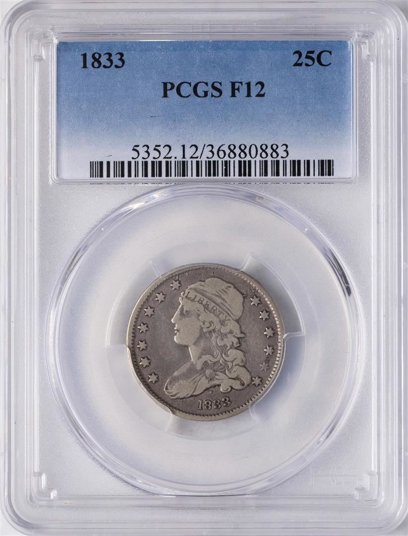 One 1833 Capped Bust Quarter Coin PCGS F12. PCGS Graded.
