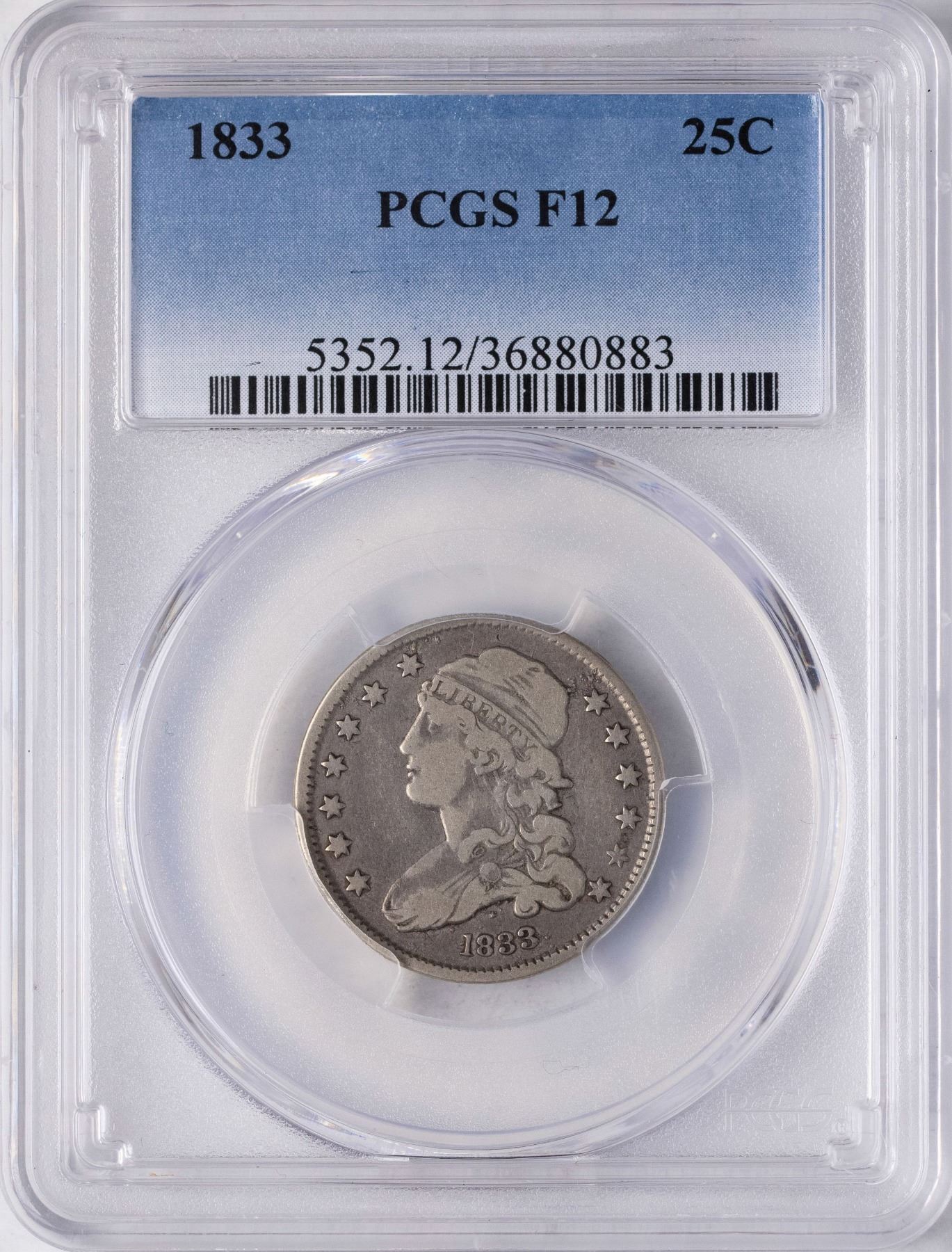 One 1833 Capped Bust Quarter Coin PCGS F12.