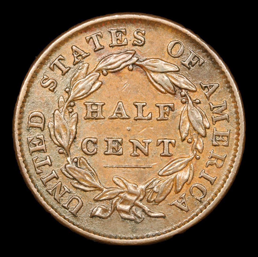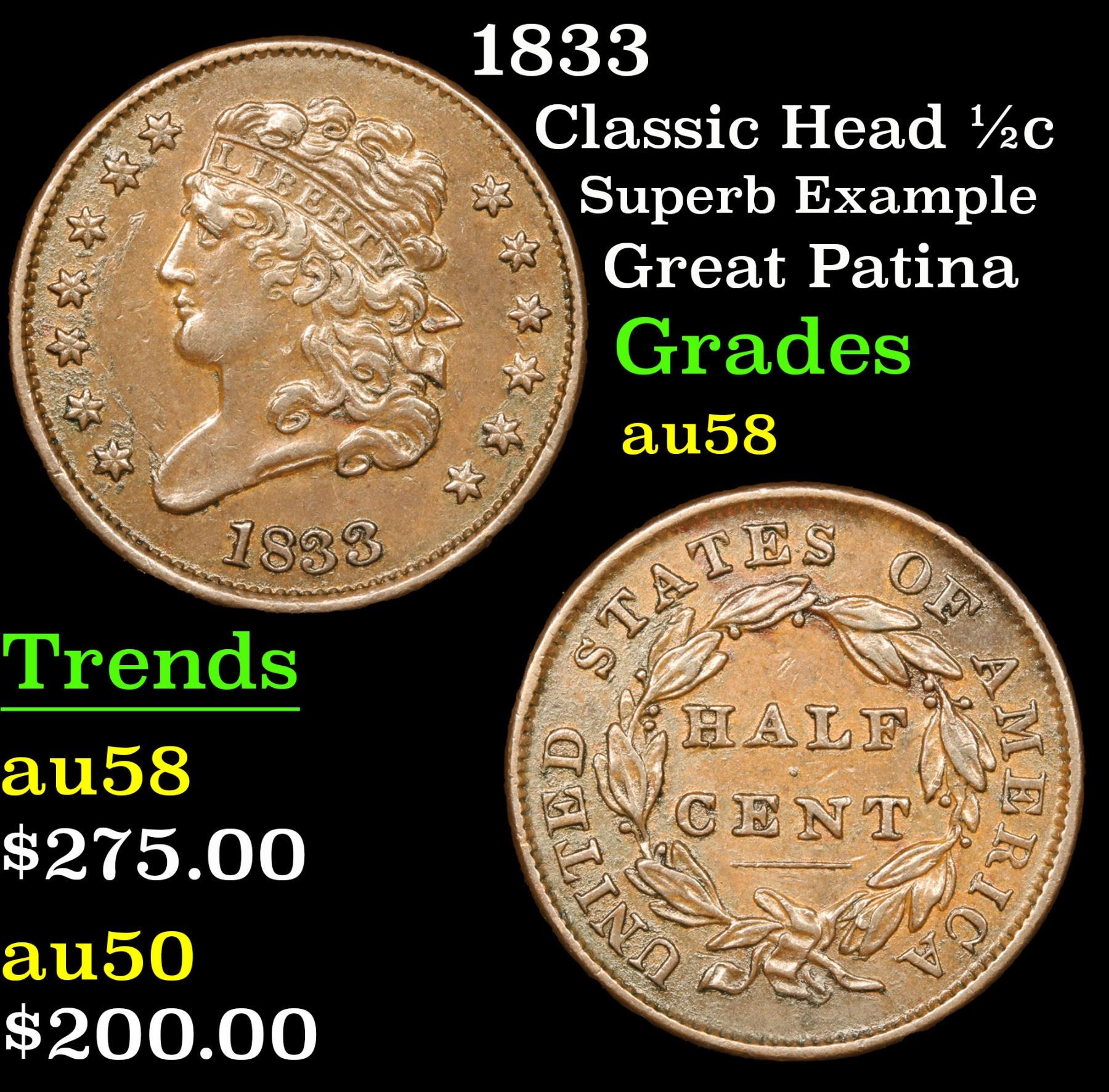 1833 Classic Head half cent 1/2c Grades Choice AU/BU Slider. Superb Example; Great Patina A Corey's Pick, Bid to Win Coin