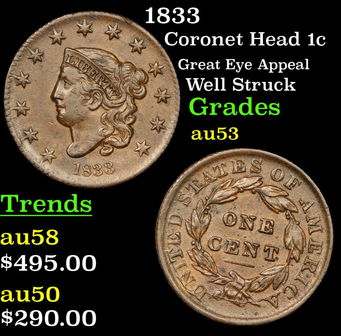 1833 Great Eye Appeal Well Struck Coronet Head Large Cent 1c Grades Select AU. A Corey's Pick, Bid to Win, Don't let it get Away Coin