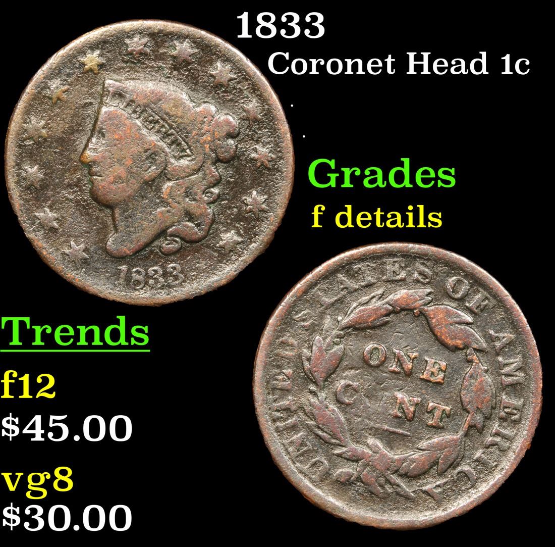 1833 . . Coronet Head Large Cent 1c Grades f details.