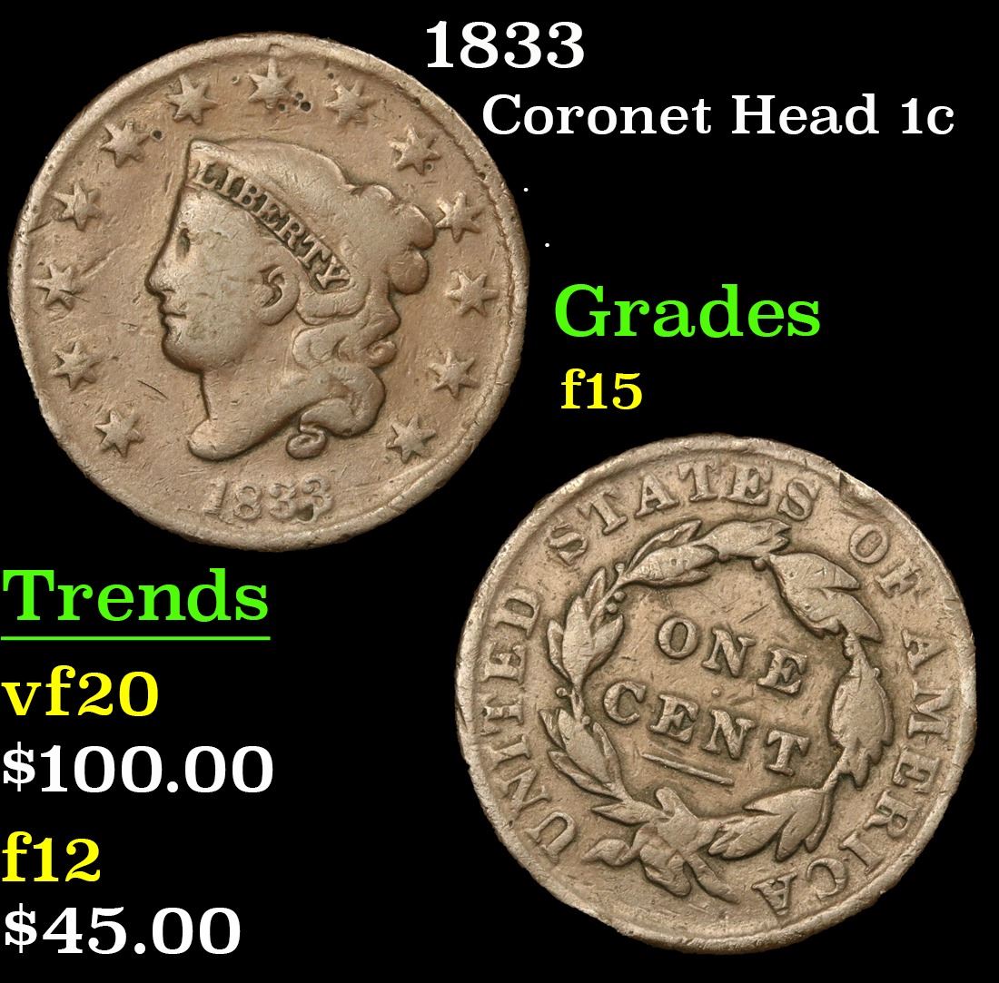 1833 . . Coronet Head Large Cent 1c Grades f+.