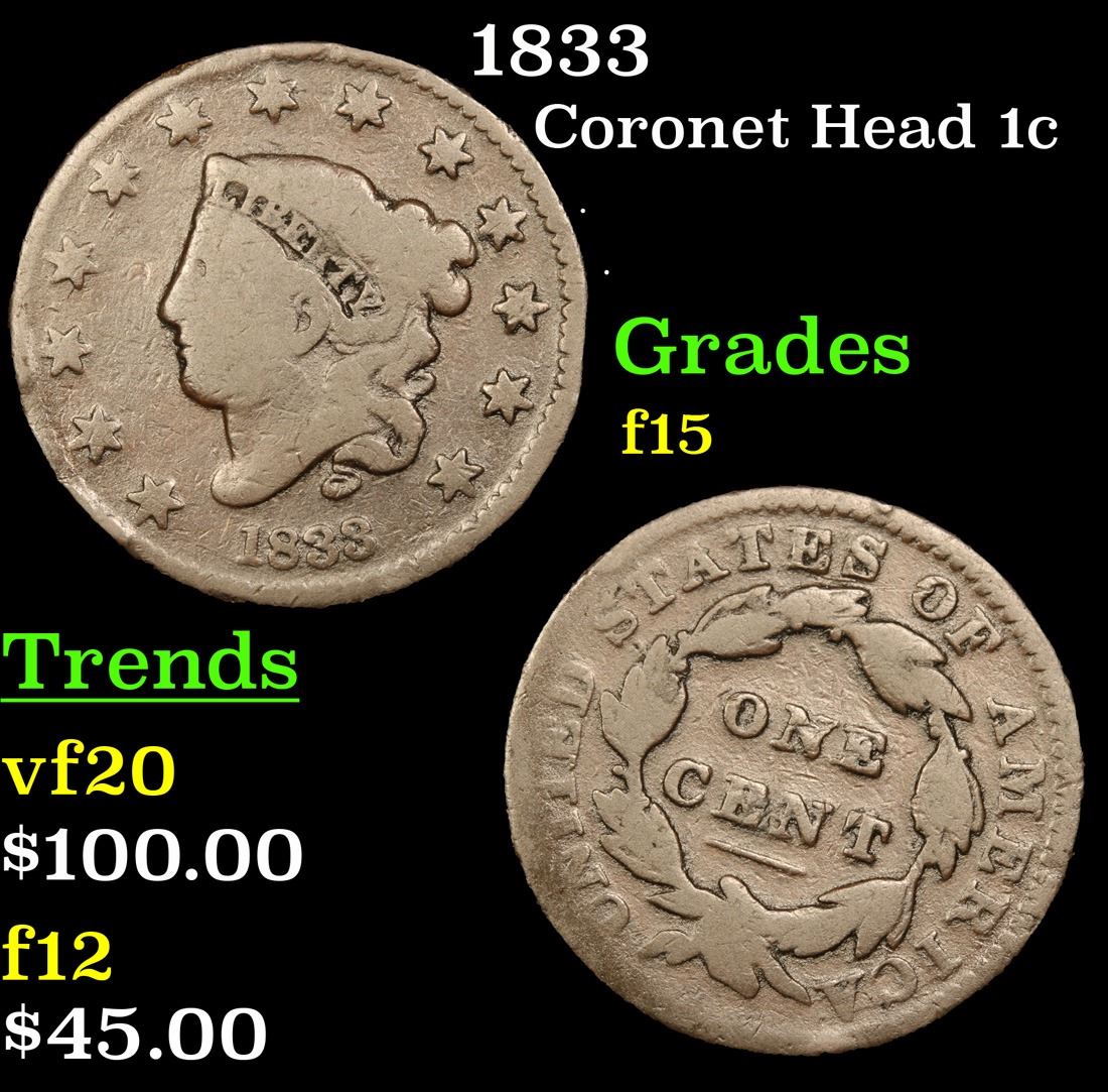 1833 . . Coronet Head Large Cent 1c Grades f+.