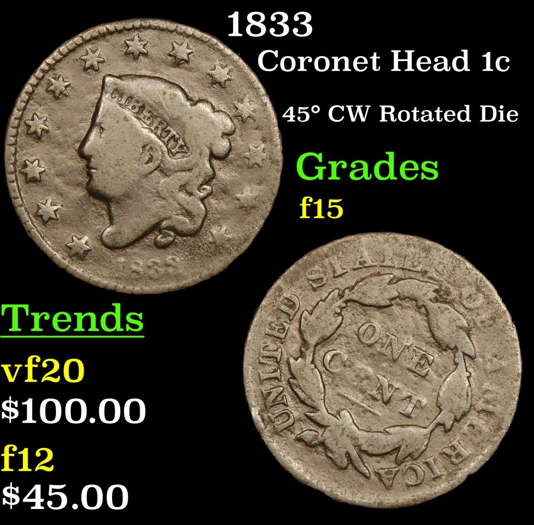 1833 45° CW Rotated Die . Coronet Head Large Cent 1c Grades f+.