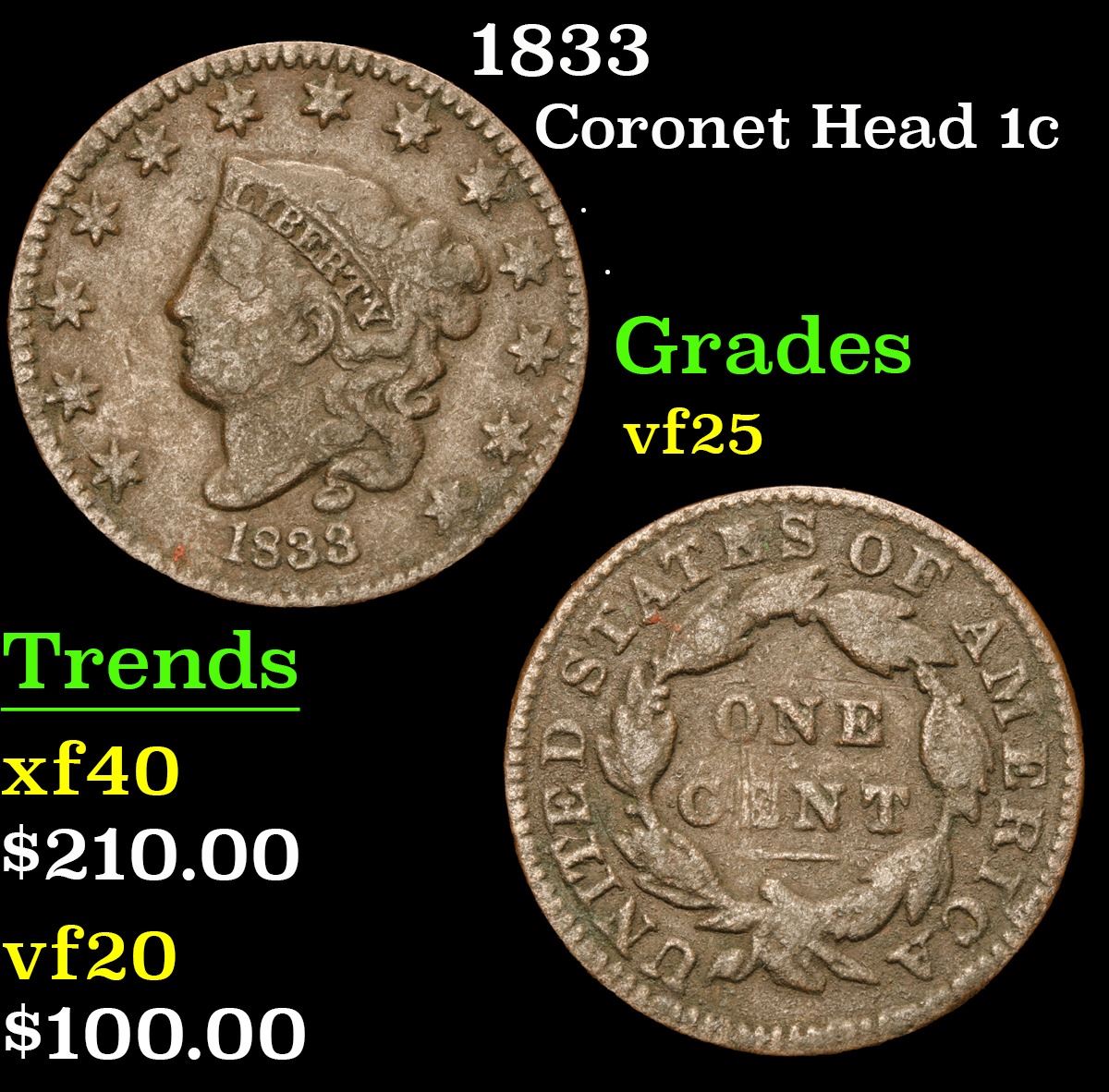 1833 . . Coronet Head Large Cent 1c Grades vf+.