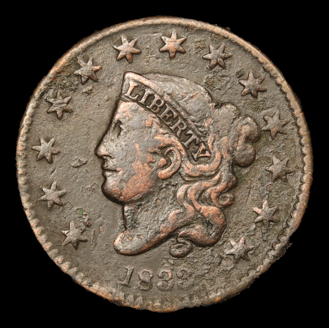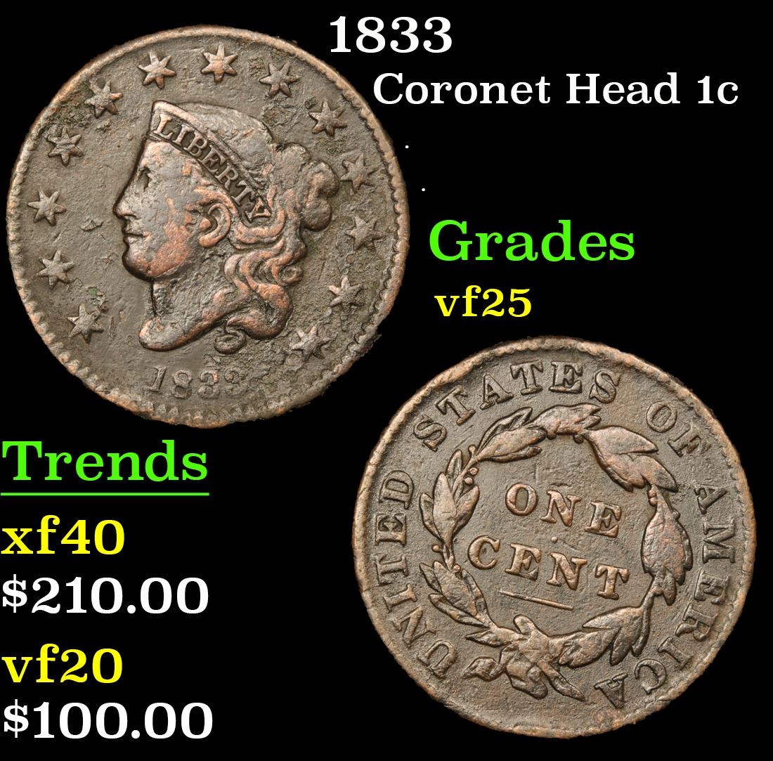 1833 Coronet Head Large Cent 1c Grades vf+.