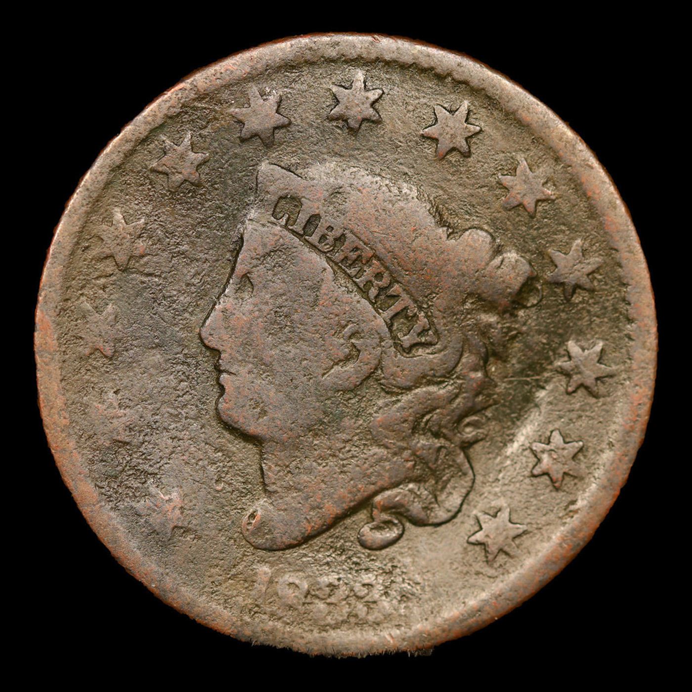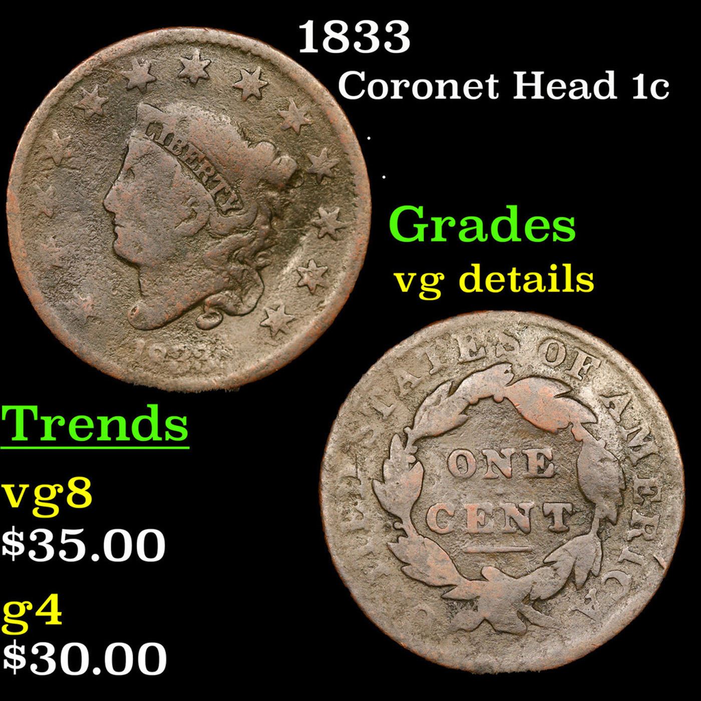 1833 Coronet Head Large Cent 1c Grades vg details.