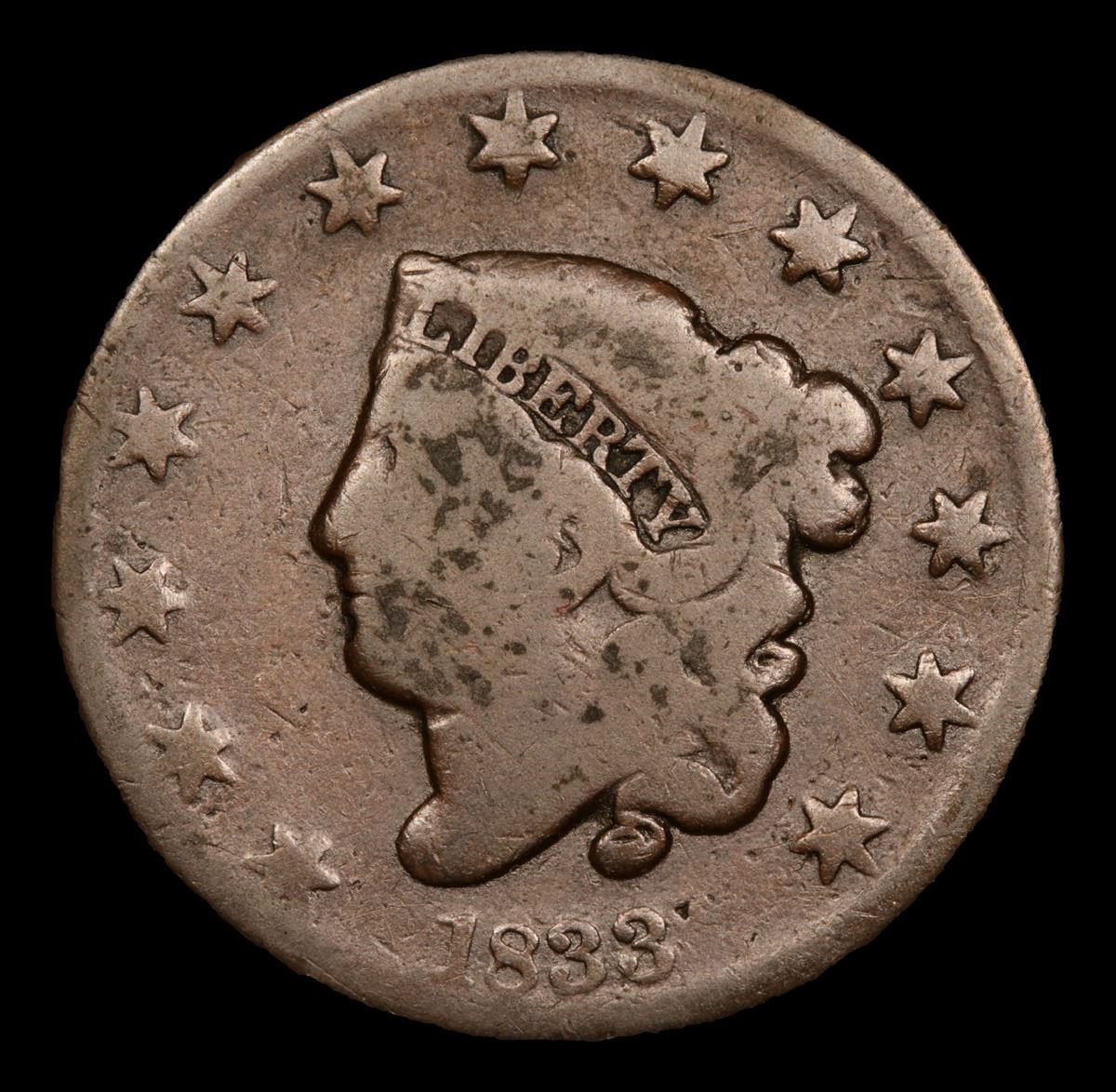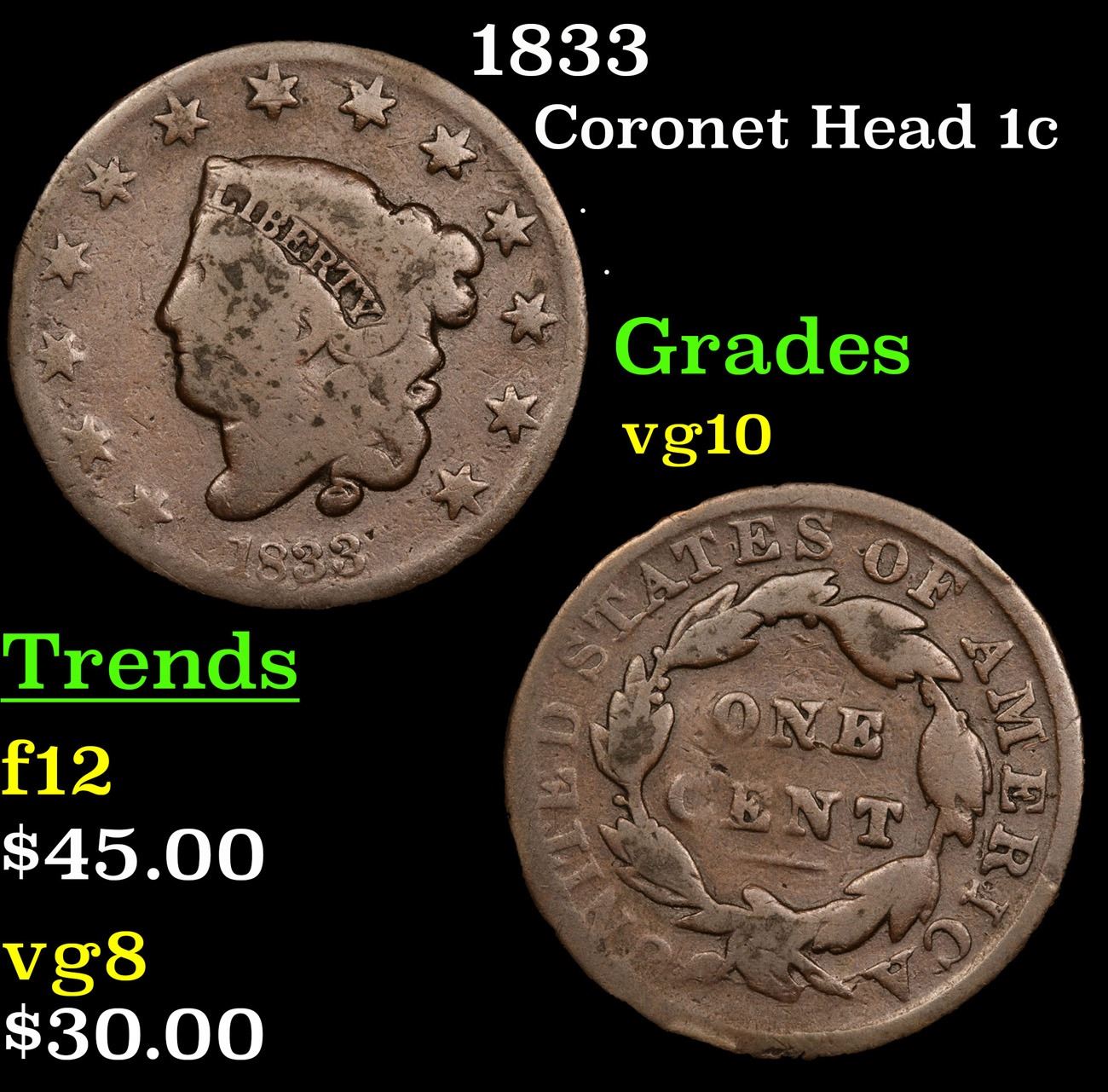 1833 . . Coronet Head Large Cent 1c Grades vg+.