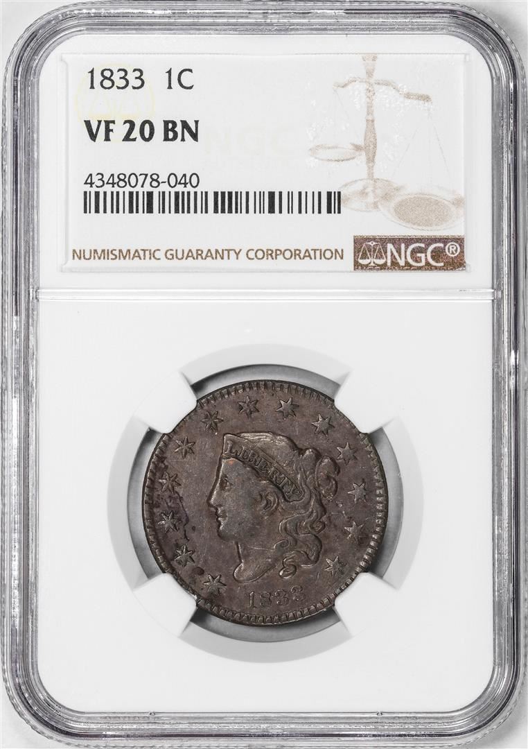 One 1833 Coronet Head Large Cent Coin NGC VF20BN. NGC Certified.