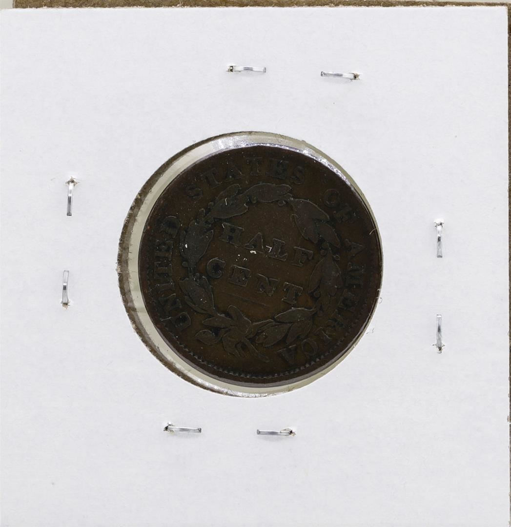One 1833 Draped Bust Half Cent Coin.