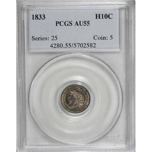 <B>1833 H10C AU55 PCGS.</B></I> PCGS Population (35/334). NGC Census: (19/430). Mintage: 1,370,000. Numismedia Wsl. Price for NGC/PCGS coin in AU55: $217. (#4280)<BR><BR><B>Coin Engraver:</B> William Kneass<BR><BR><b>Shipping:</b> Coins & Currency (<a target="_blank" href="http://www.heritageauctions.com/common/shipping.php">view shipping information</a>)