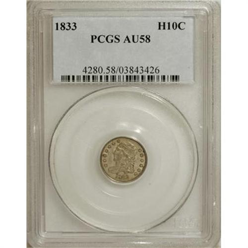 <B>1833 H10C AU58 PCGS.</B></I> PCGS Population (57/270). NGC Census: (66/359). Mintage: 1,370,000. Numismedia Wsl. Price for NGC/PCGS coin in AU58: $242. (#4280)<BR><BR><B>Coin Engraver:</B> William Kneass<BR><BR><b>Shipping:</b> Coins & Currency (<a target="_blank" href="http://www.heritageauctions.com/common/shipping.php">view shipping information</a>\)