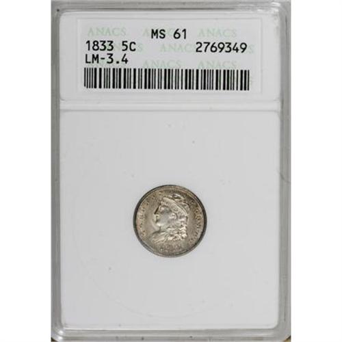 <B>1833 H10C MS61 ANACS.</B></I> LM-3.4. NGC Census: (23/333). PCGS Population (10/251). Mintage: 1,370,000. Numismedia Wsl. Price for NGC/PCGS coin in MS61: $342. (#4280)<BR><BR><B>Coin Engraver:</B> William Kneass<BR><BR><b>Shipping:</b> Coins & Currency (<a target="_blank" href="http://www.heritageauctions.com/common/shipping.php">view shipping information</a>\)