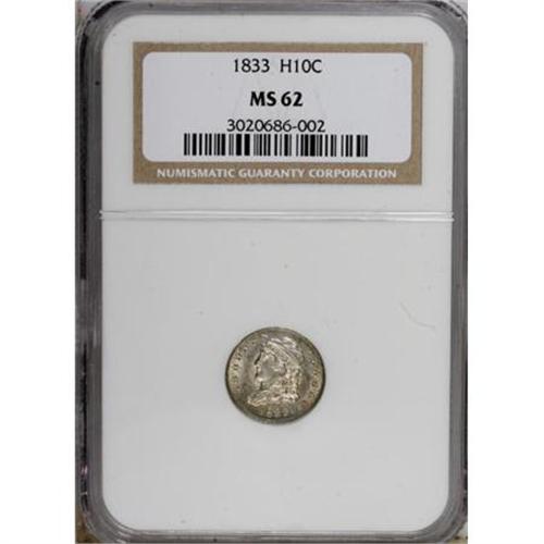 <B>1833 H10C MS62 NGC.</B></I> NGC Census: (55/280). PCGS Population (54/197). Mintage: 1,370,000. Numismedia Wsl. Price for NGC/PCGS coin in MS62: $367. (#4280)<BR><BR><B>Coin Engraver:</B> William Kneass<BR><BR><b>Shipping:</b> Coins & Currency (<a target="_blank" href="http://www.heritageauctions.com/common/shipping.php">view shipping information</a>)