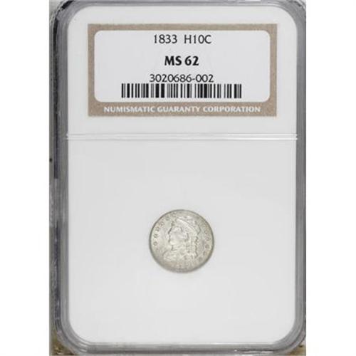 <B>1833 H10C MS62 NGC.</B></I> NGC Census: (55/280). PCGS Population (54/201). Mintage: 1,370,000. Numismedia Wsl. Price for NGC/PCGS coin in MS62: $367. (#4280)<BR><BR><B>Coin Engraver:</B> William Kneass<BR><BR><b>Shipping:</b> Coins & Currency (<a target="_blank" href="http://www.heritageauctions.com/common/shipping.php">view shipping information</a>)