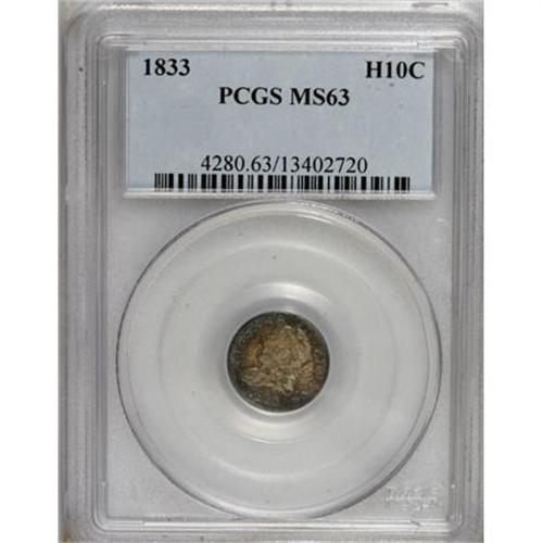 <B>1833 H10C MS63 PCGS.</B></I> V-6, LM-9, R.2. Russet-brown, plum-mauve, and deep sea-green embrace this satiny and unmarked example. The forehead curls and left shield border are softly brought up, but the eye appeal is that of a higher grade.<BR><BR><B>Coin Engraver:</B> William Kneass<BR><BR><b>Shipping:</b> Coins & Currency (<a target="_blank" href="http://www.heritageauctions.com/common/shipping.php">view shipping information</a>)