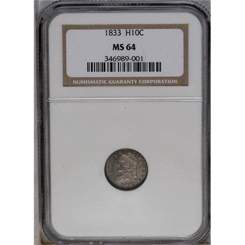 <B>1833<H10C> MS64 NGC.</B></I> V-4, LM-3, R.2. Medium apple-green and rose-brown coat this shimmering and smooth near-Gem. The strike is needle-sharp. A tiny rim nick at 9:30 on the obverse denies a finer assessment. Struck from clashed dies.