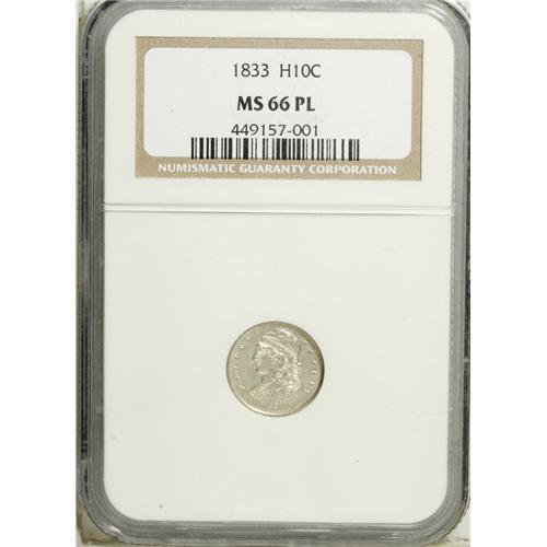 <B>1833 H10C MS66 Prooflike NGC.</B></I> V-1, LM-10, R.1. Well struck with substantial reflectivity noted in the fields, an untoned obverse, and a richly toned reverse. A faint vertical die crack travels across the lower half of Liberty's portrait, and a shallow adjust mark extends from the chin to the ear, but post-striking blemishes seem absent on both sides of the coin. An attractive and conditionally elusive Premium Gem. Census: 27 in 66, 13 finer (10/06).<BR><I>From The Park Cities Collection.</B></I><BR><BR><b>Shipping:</b> Coin/Currency (<a target="_blank" href="http://www.heritageauctions.com/common/shipping.php">view shipping information</a>)