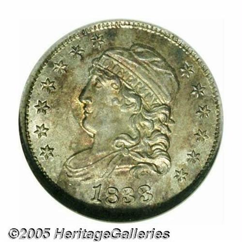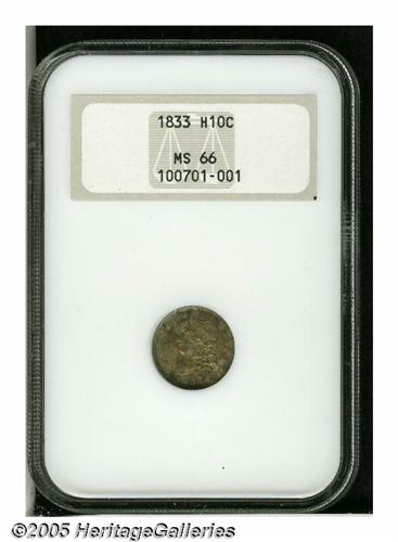 <B>1833<H10C> MS66 NGC.</B></I> V-3, LM-4, R.2. The V-3 die marriage is a common one and it is a die pairing that is encountered with some degree of frequency in mint condition. That being said, this coin is undoubtedly one of the finest, if not <I>the</B></I> finest example of the variety known. The mint luster on this piece is outstanding. At first that doesn't sound like much of a statement, until one sees this coin and sees the plethora of multiple colorations that are splashed over each side. Rich crimson, lilac, olive, and golden colors are scattered about and are enlivened considerably by the underlying mint frost. The only mentionable defect is that the striking details are not quite fully brought up on Liberty's hair curls and the eagle's plumage.