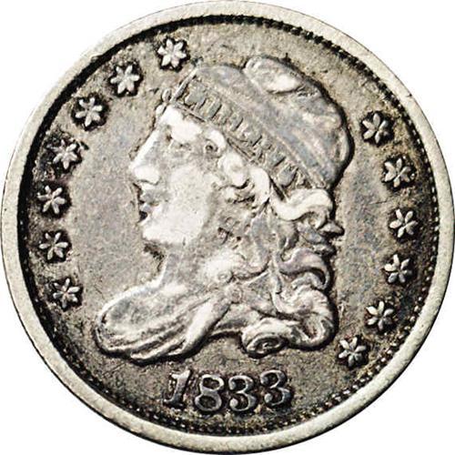 <B>1833<H10C> V-2, LM-8, R.2. Reiver state a. VF35 NGC.</B></I> Dark gray with lighter silver on portions of the devices. Minor handling marks and nicks are seen, including a small cluster below her ear. An early die state before the reverse forms the cracks which lead to the retained cud at ITED STA.<BR><I>Ex: J. J. Teaparty (March 1985).</B></I> Envelope Included.