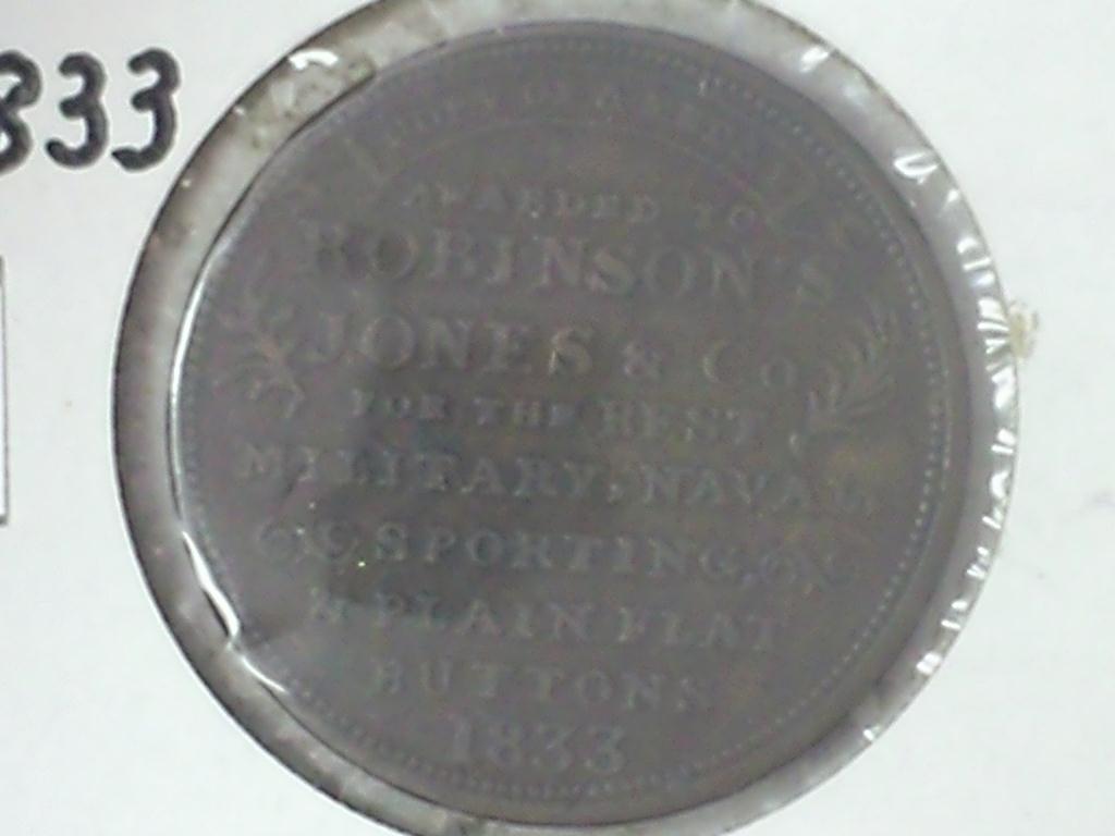 AWARDED TO ROBINSON'S JONES AND COMPANY FOR THE BEST MILITARY, NAVAL, SPORTING AND PLAIN FLAT BUTTONS