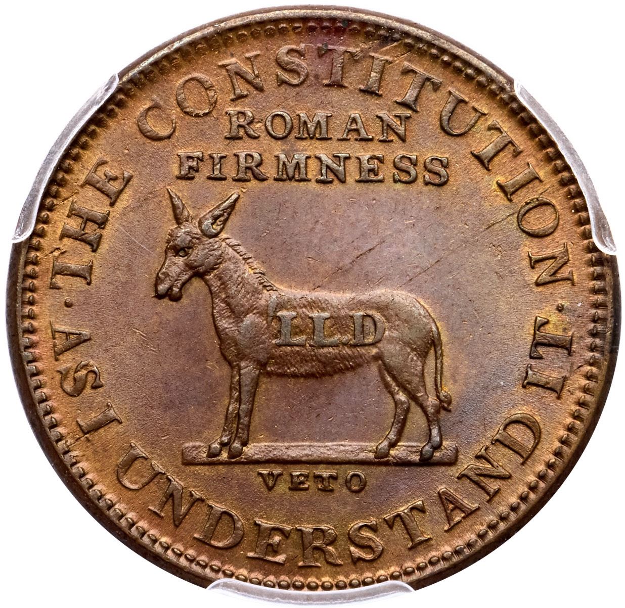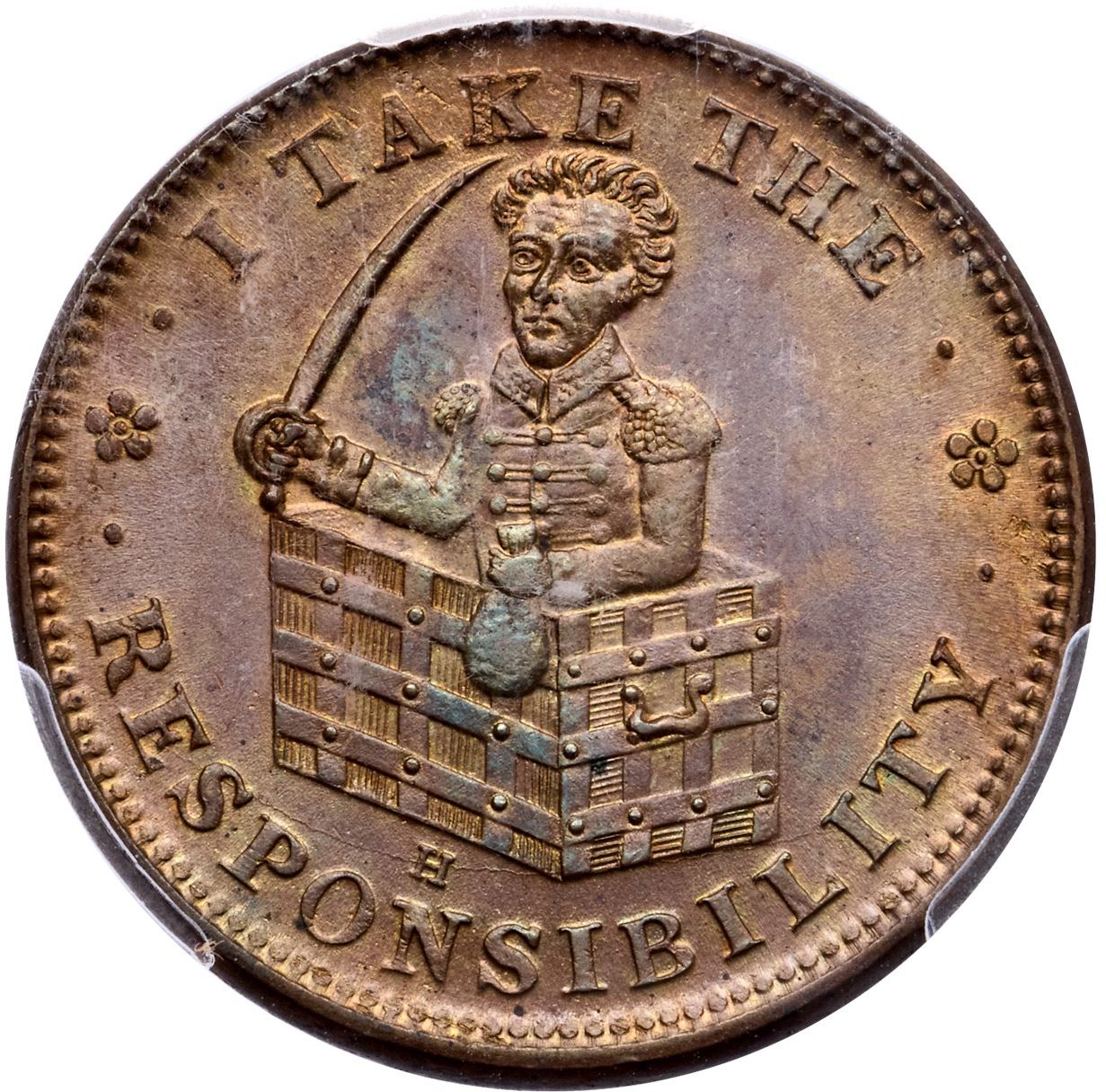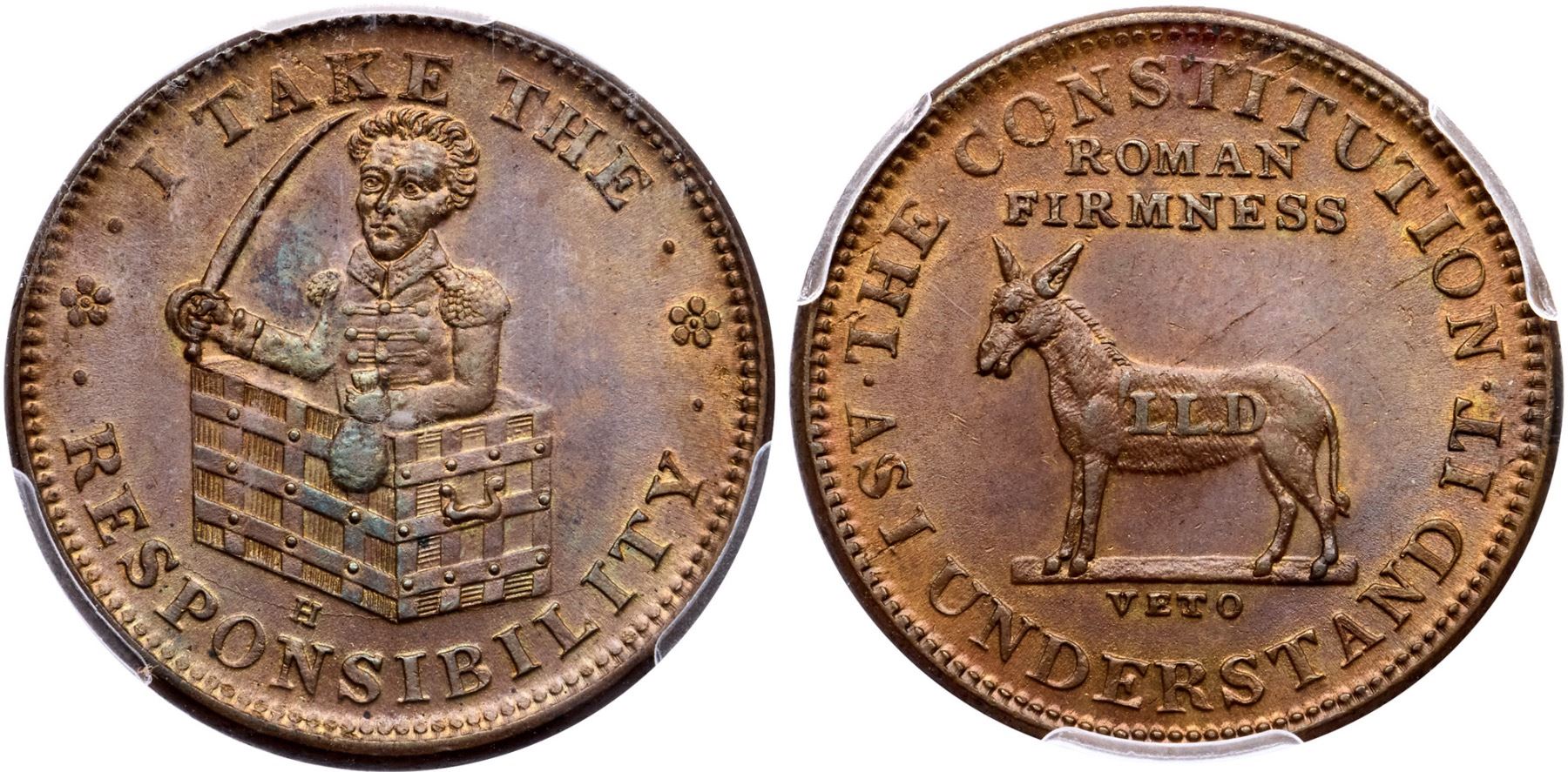 (1833) HTT, HT-70, Low-51 R-1 PCGS MS63BNLustrous olive and faded mint orange with subtle bluish steel tones. There are a couple diagonal, faint striations on the reverse, but otherwise free of marks. Frosty, lustrous surfaces. Plain Edge.77366.63/56914689