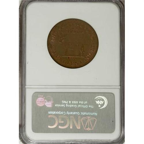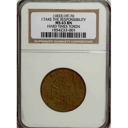 <B>(1833) Hard Times Token, I Take the Responsibility, MS63 Brown NGC.</B></I> Low-51, HT-70, R.1. An excellent example of this early Hard Times token variety, fully struck and lustrous with unmarked surfaces. Two or three minor carbon spots are noted on the lower obverse. <BR><BR><b>Shipping:</b> Coins & Currency (<a target="_blank" href="http://www.heritageauctions.com/common/shipping.php">view shipping information</a>)