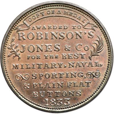 1833 Hard Times Token Rulau HT-152, Low-75 R2. NGC graded MS-65 Brown. Lustrous mint red fading to light olive and steel brown, about 25% of the faded red remaining. Sharply struck and absolutely choice. A gem example of this piece from the Attleboro Massachusetts merchant Robinson's Jones & Co. The attribution is noted on the NGC label.